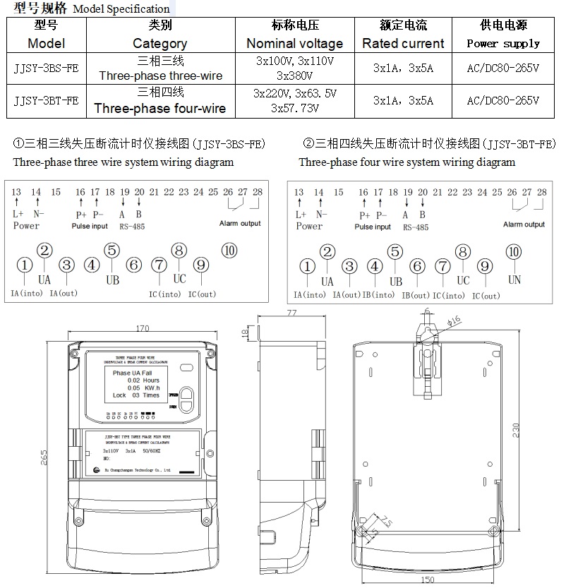 JJSY系列三相失壓斷流計(jì)時(shí)儀適用于電力三相三線(xiàn)、三相四線(xiàn)系統(tǒng),通過(guò)對(duì)電網(wǎng)電壓(PT)回路、電流(CT)回路進(jìn)行監(jiān)視,能準(zhǔn)確判斷電網(wǎng)運(yùn)行狀態(tài),并詳細(xì)記錄其處于故障期間的各種參數(shù),以便供電部門(mén)對(duì)電網(wǎng)進(jìn)行管理,追補(bǔ)人為或非人為的漏計(jì)電能。 全英文菜單