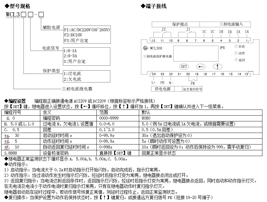 參數(shù):三相電流過流、欠流,啟動,復(fù)歸,延時保護(hù)