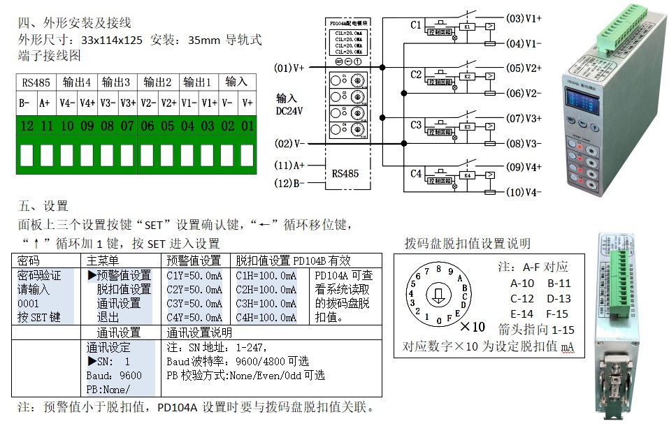 PD104系列直流配電控保模塊是DC24V直流配電系統(tǒng)控制保護模塊,以下簡稱模塊,該模塊具備1路輸入、4路輸出控制電源,同時OLED液晶實時顯示4路電流值。