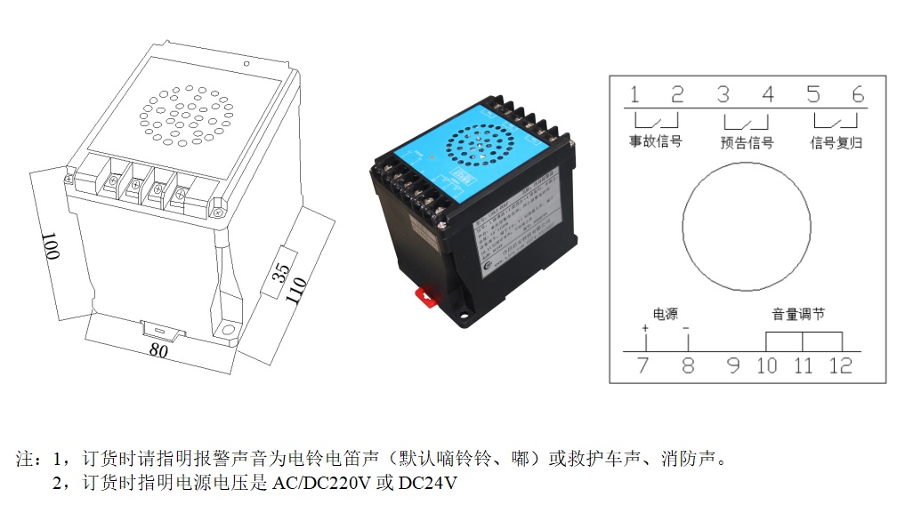 音量調(diào)節(jié):報警器默認(rèn)低音量,端子10-11-12三個端子為音量調(diào)節(jié)端子,10-11短接中音量,10-12短接高音量,不短接為低音量。