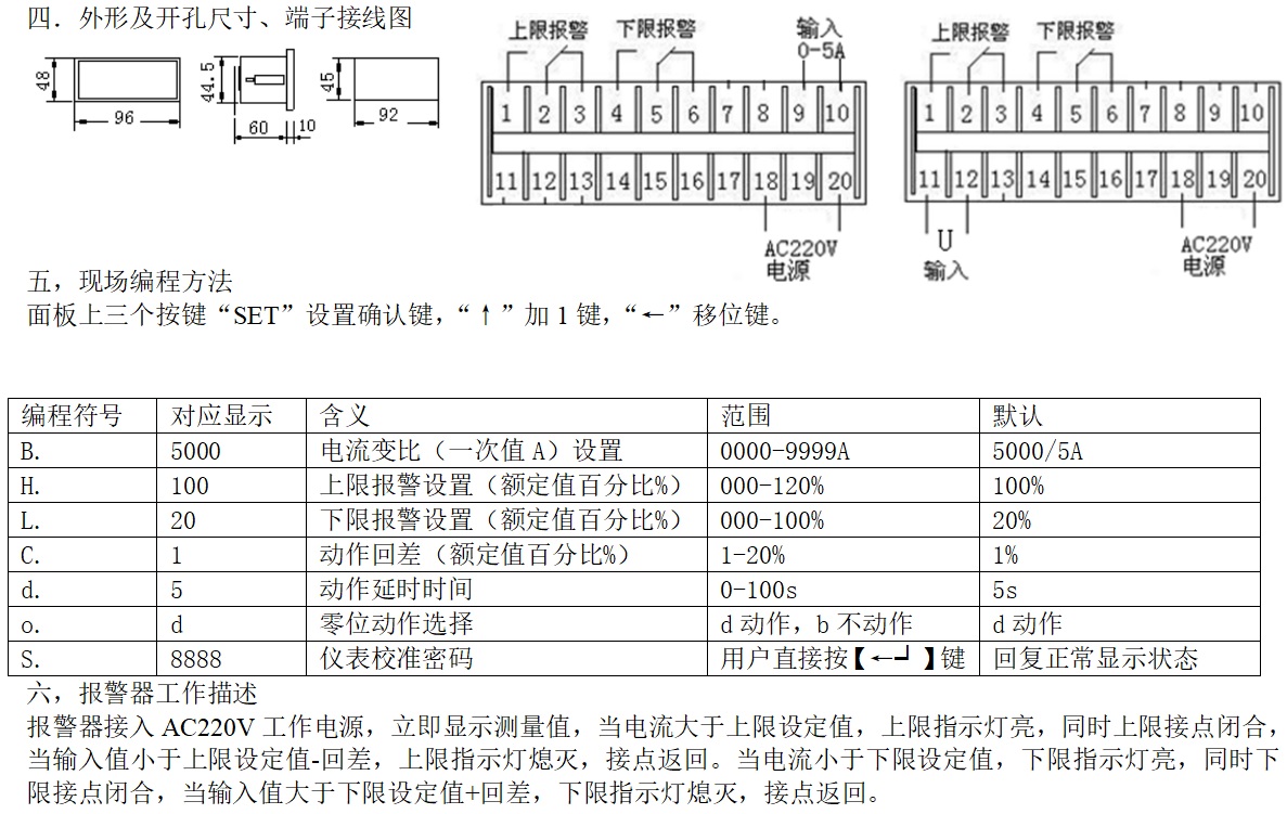 報警輸出:過流和低電流值可設(shè)置,兩路繼電器接點輸出