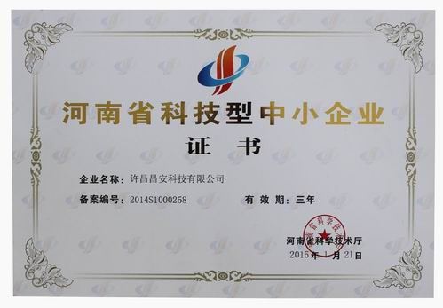 2015年1月21日,許昌昌安科技有限公司被河南省科學(xué)技術(shù)廳認定為“河南省科技型中小企業(yè)”,并頒發(fā)證書。